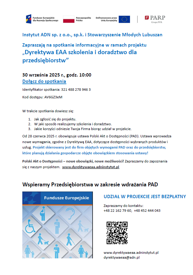Beata GontarzAutor, Beata Gontarz 154Ilość wyświetleń, 154Link do spotkania w dniu 30.09.2025 r.: Identyfikator spotkania: 321 488 278 946 3, Kod dostępu: AV6GZ3eM Szczegółowe informacje o projekcie dostępne są na stronie: www.dyrektywaeaa.adninstytut.pl Więcej informacji w załączniku. |