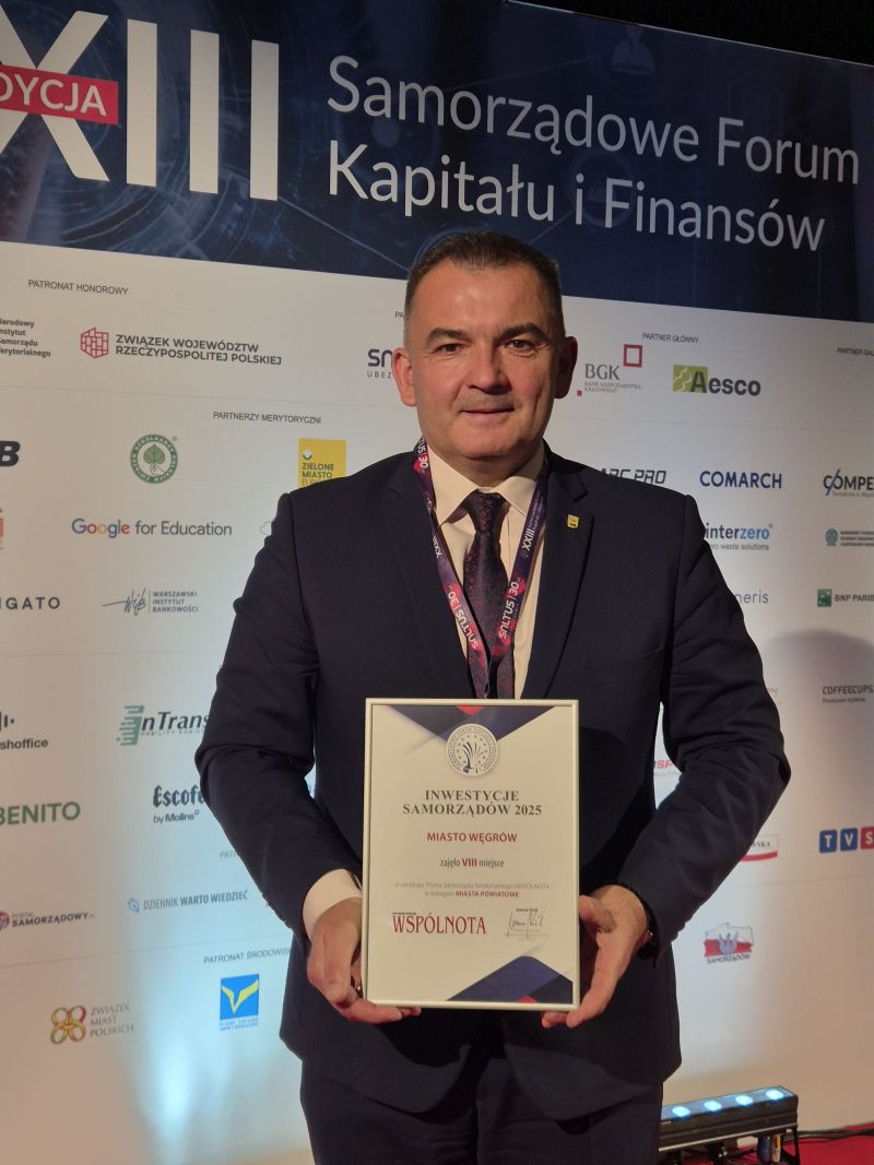 Miasto Węgrów zajęło 8. miejsce w Polsce w rankingu Pisma Samorządu Terytorialnego WSPÓLNOTA w kategorii Miasta Powiatowe – Inwestycje Samorządów 2025. Uroczyste wręczenie nagród odbyło się 6-7.10.2025 r. w Katowicach, w którym uczestniczył Burmistrz Węgrowa Pan Paweł Marchela.