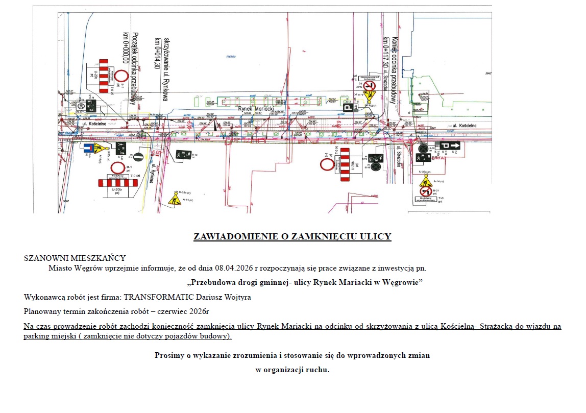Informujemy, że od 08.04.2026 r. (środa) rozpoczynają się prace związane z przebudową ulicy Rynek Mariacki na odcinku od skrzyżowania z ulicą Kościelną - Strażacką do wjazdu na parking miejski (zamknięcie nie dotyczy pojazdów budowy). Prosimy o wykazanie zrozumienia i stosowanie się do wprowadzonych zmian w organizacji ruchu.